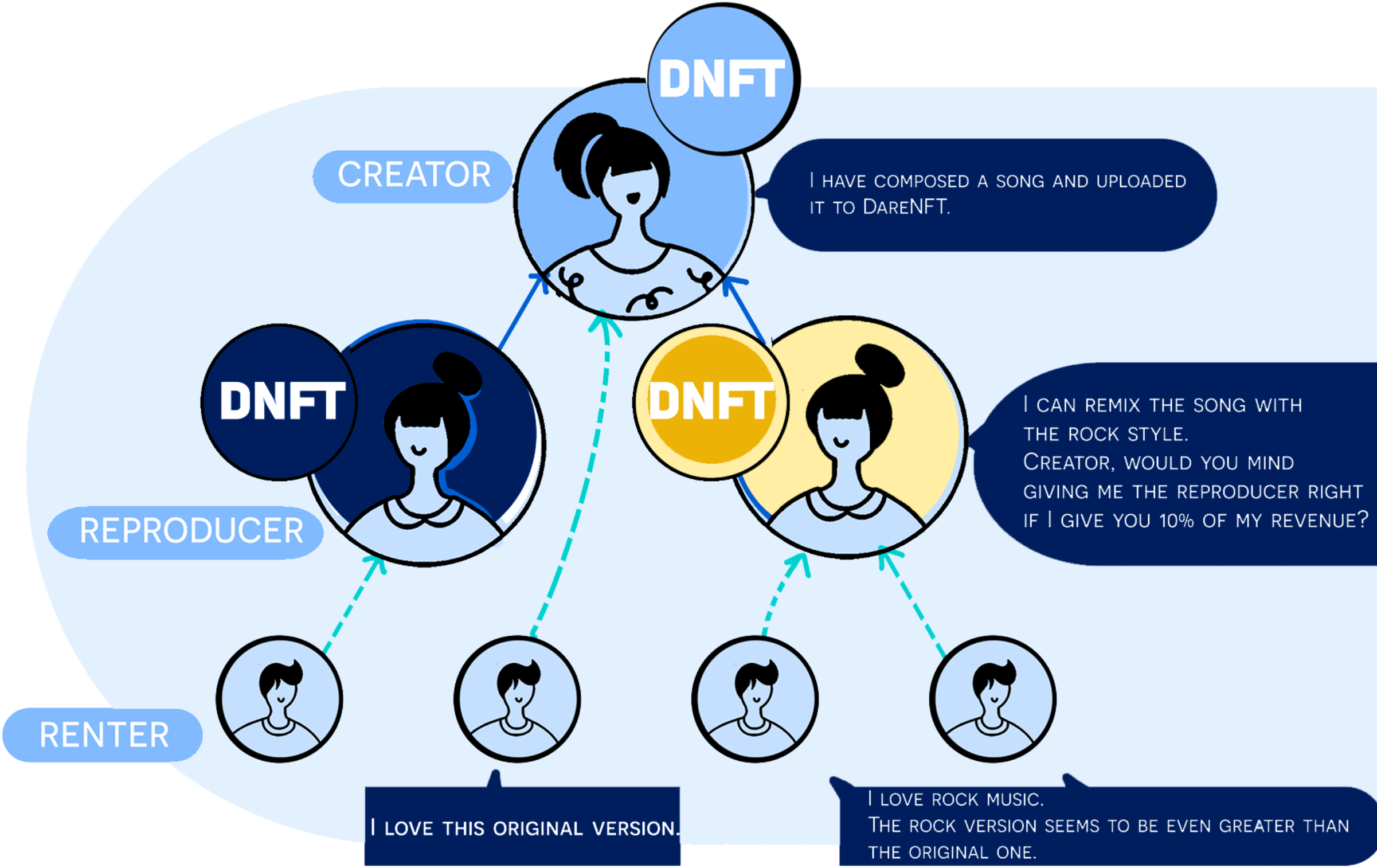 Creators receive royalties from a reproducer’s revenue via the NFT smart contract. This speeds up collaboration and sharing benefits between author and re-publisher, resulting in more income for both parties.